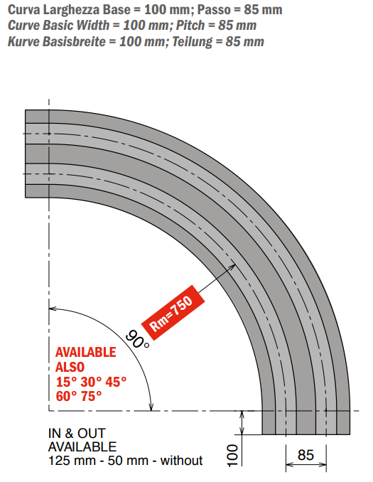 Curva magnética con base de 100 mm y paso de 85 mm. Material: Polietileno UHMW-PE. Disponible en versiones de 15°, 30°, 45°, 60°, 75°.