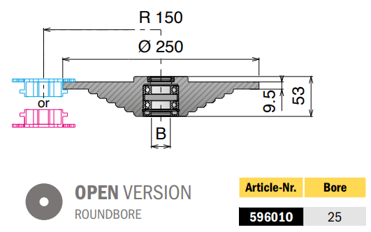 Disco de retorno mecanizado para el lado de transporte y retorno, diámetro exterior Ø 250 mm. Disponible en versiones con agujero redondo abierto o cerrado.