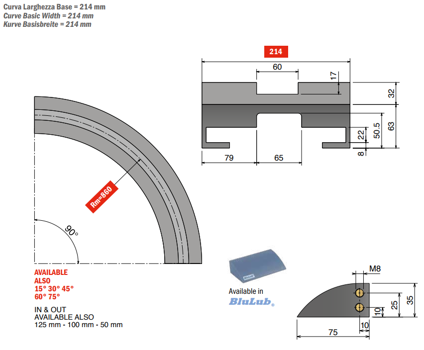 Curva magnética con ancho base de 214 mm, material Polietileno UHMW-PE. Disponible en ángulos de 15°, 30°, 45°, 60°, 75°.